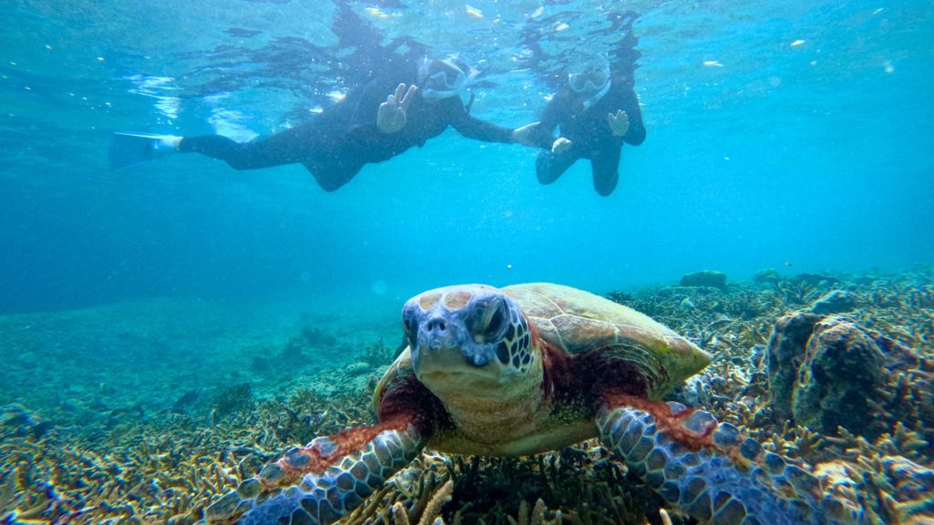遭遇率99.99%を誇るポイントをガイドがご案内!ウミガメと一緒に泳ぐ感動の瞬間を、プロ仕様のGoProでしっかり撮影します。